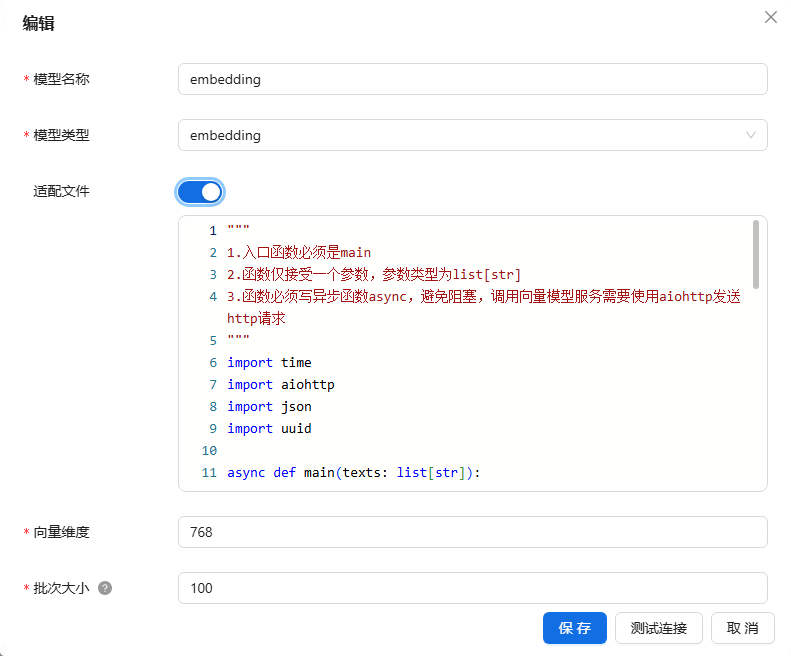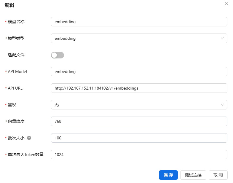 进入模型管理页面,点击小模型>新建,填写相关配置信息(不开启适配文件)。点击测试连接;如果测试连接成功,点击保存。