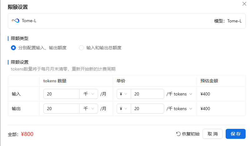 当在大模型接入配置时,如果开启了模型Token使用配额功能,可点击资源管理>配额管理,进行配额配置。如下图所示,