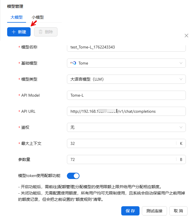进入模型管理页面,点击模型管理>大模型>新建,填写相关配置信息,点击测试连接;如果测试连接成功,点击保存。