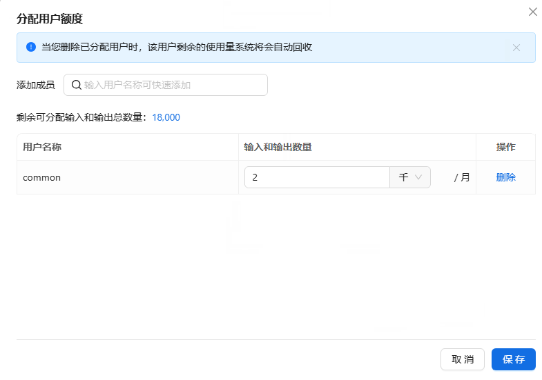 通过分配用户额度可进行具体用户的使用额度设置,如下图所示: